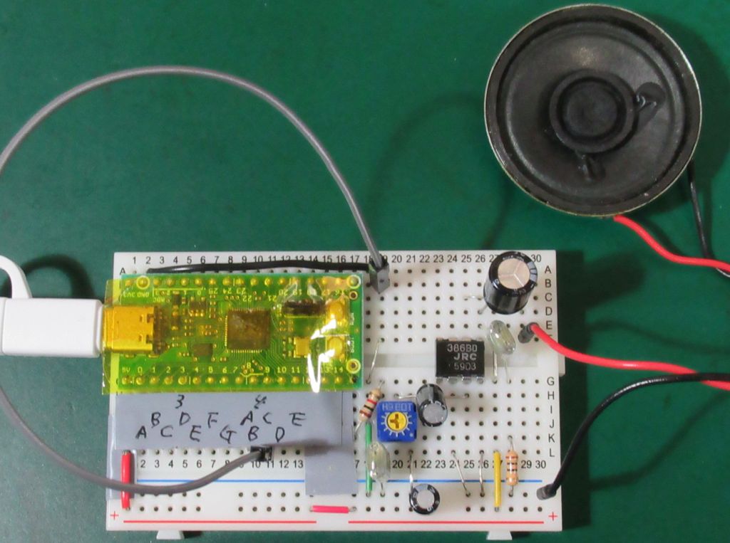 picoのポートにPWMで出力。今どきはD級アンプ構成が主流だが、手元にはレトロなアンプICがいっぱいあるので、平滑してシングルエンドでスピーカー駆動にした