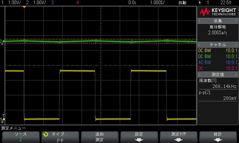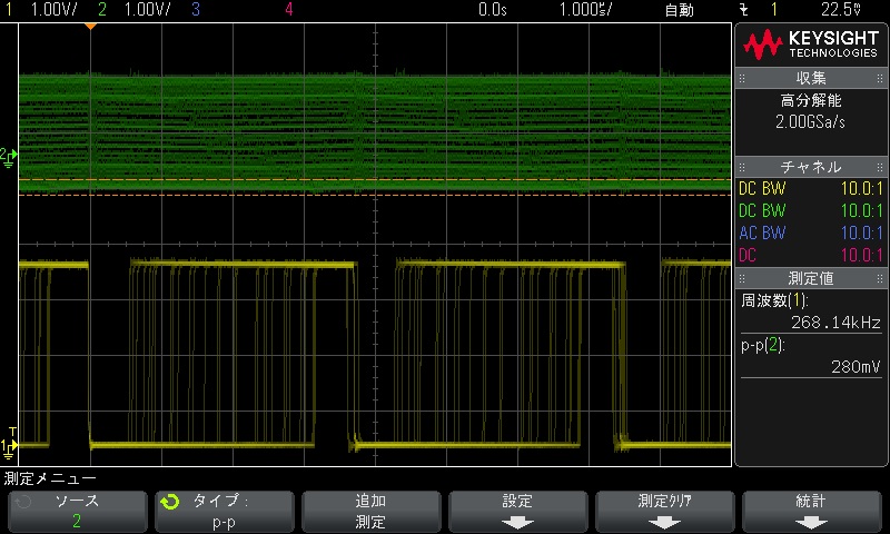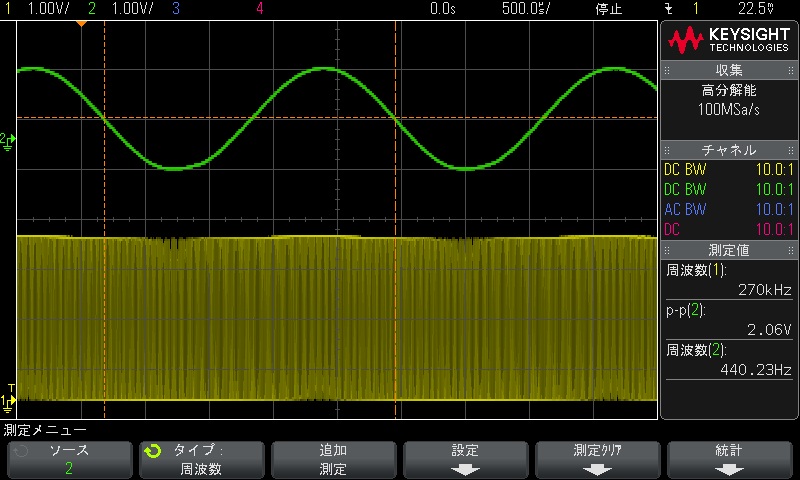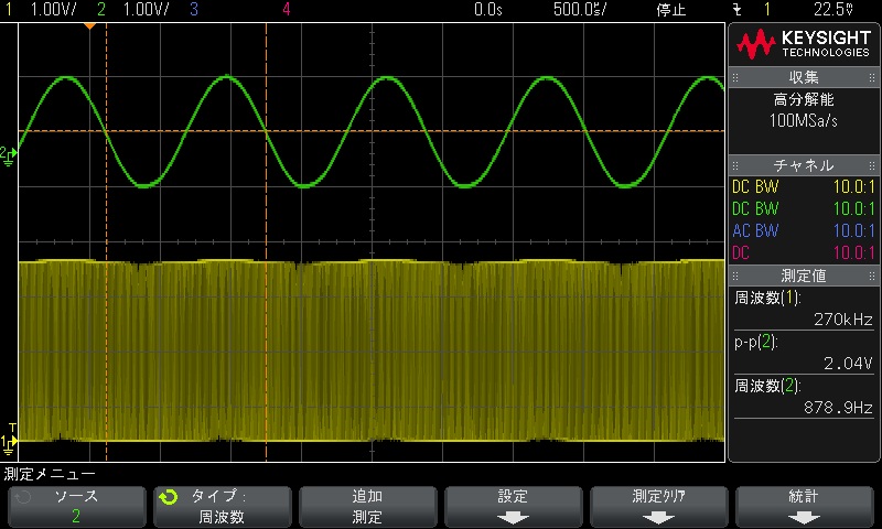 PWM周波数は実測270KHzです。D級駆動にするにはちょっと高すぎるかもしれません。まして普通のアナログアンプではとても追いつきませんね
