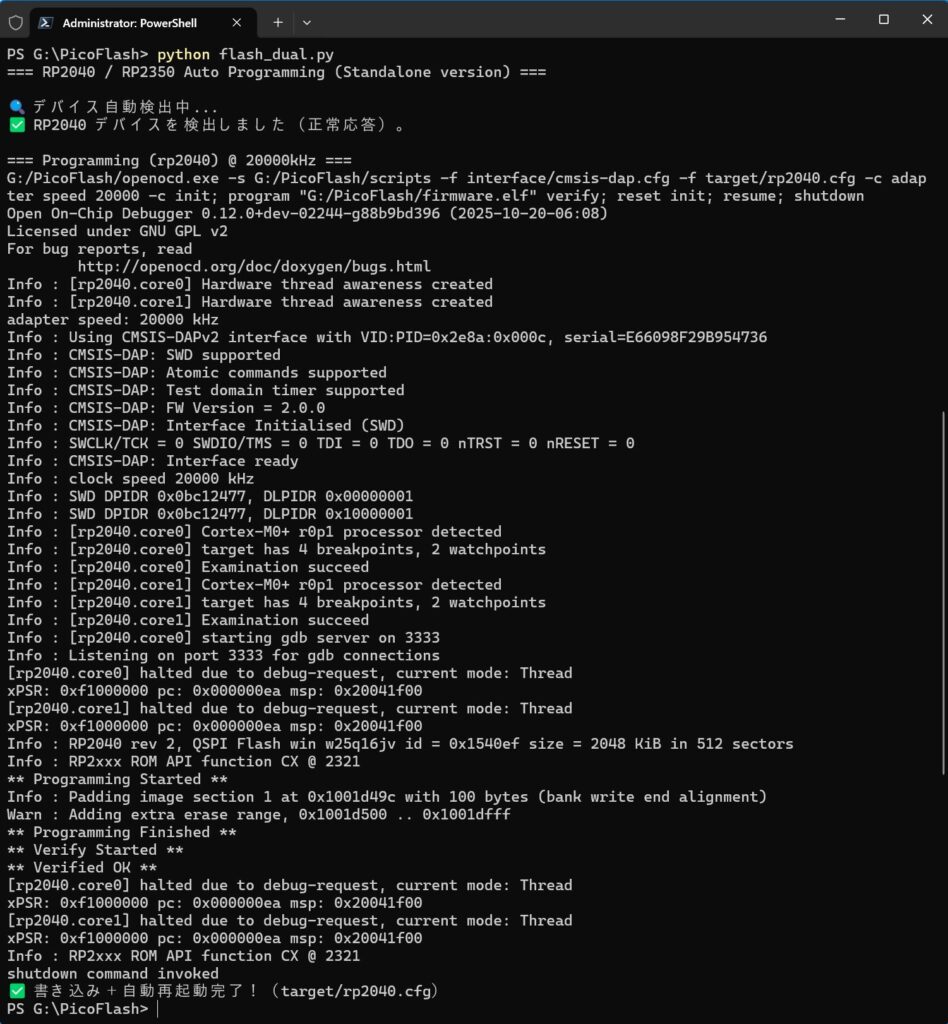 ※公式debug probeでも動作確認済み。ただし、複数のprobeには対応していません下は、USBドライブ\PicoFlashに格納してPowerShellで実行した結果です