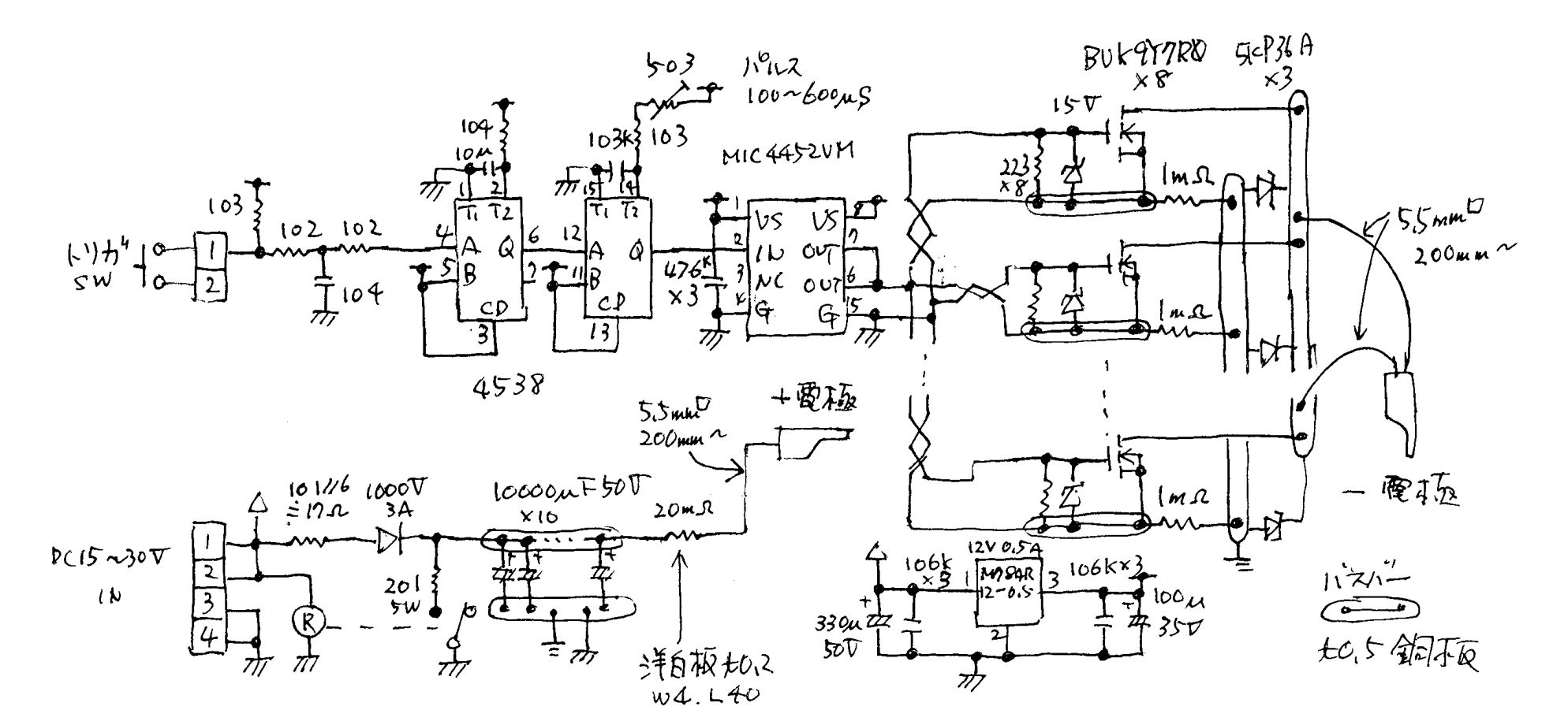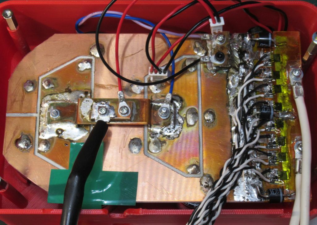 チャージ部のベタ、ドライブ部のバスバーはすべてt0.5の銅板で製作。一部+の橋渡しにt1も使った。