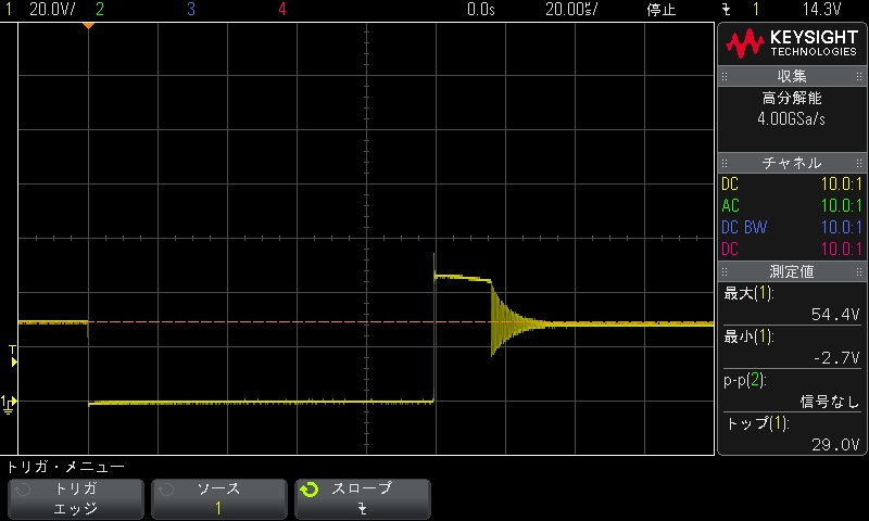 短絡OFF時のVds波形は下図。ピークは54.4V約100ns、そのあと48V前後約18us程度で定格以内に収まる。溶接時はさらに下がる
